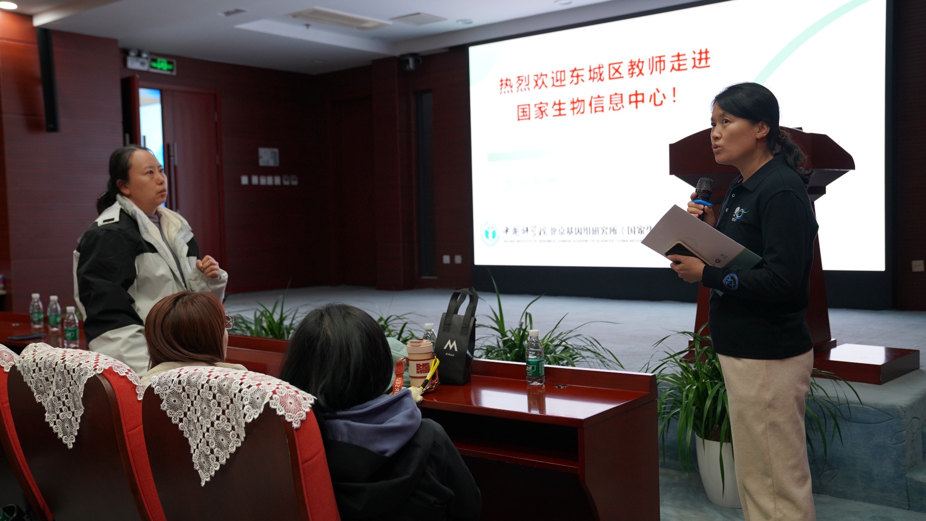 在交流环节,气氛热烈而深入。来自国家生物信息中心的郝丽丽、史悦副研究员,以及池旭、张丽媛助理研究员,首先分享了各自在基因组学、数据分析等领域的研究方向,并与教师们展开了面对面的深入交流。教师们踊跃提问,问题既涵盖了日常教学中的困惑,也涉及到对生命科学热点问题的思考。专家们一一解答,不仅为教师们带来了前沿的科学知识,更让教师们了解到国家生物信息中心的公开数据库可以作为宝贵的教学资源向学校开放,这为一线教学与前沿科研数据的结合提供了新的可能性